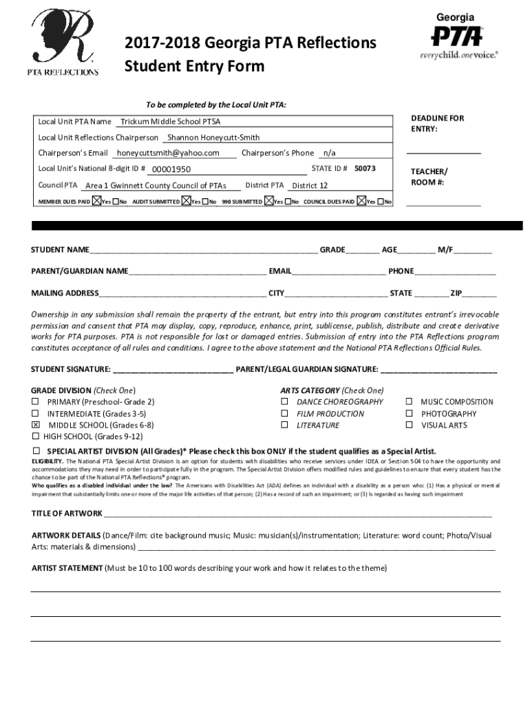 Georgia20172018 Georgia PTA Reflections Student Entry Form To be completed by the Local Unit PTA: Local Unit PTA Numerical Unit Reflections Chairperson Chairpersons EmailDEADLINE FOR ENTRY:Trickum