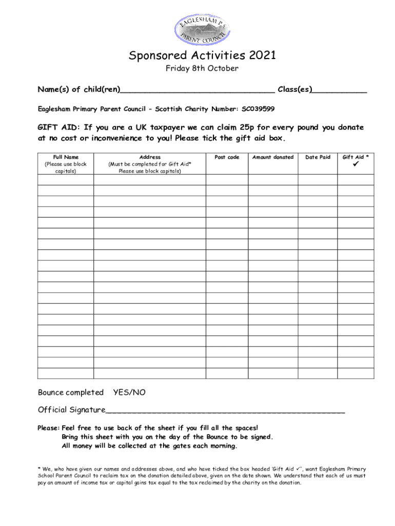Sponsored Activities 2021 Friday 8th October Name(s) of child(men)___ Class(BS)___ Eagle sham Primary Parent Council Scottish Charity Number: SC039599GIFT AID: If you are a UK taxpayer we can claim