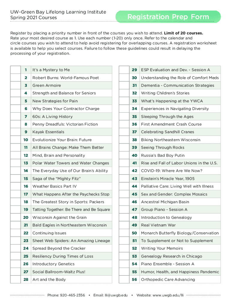 Green Bay Lifelong Learning Institute Spring 2021 CoursesRegistration Prep Preregister by placing a priority number in front of the courses you wish to attend. Limit of 20 courses. Rate your most