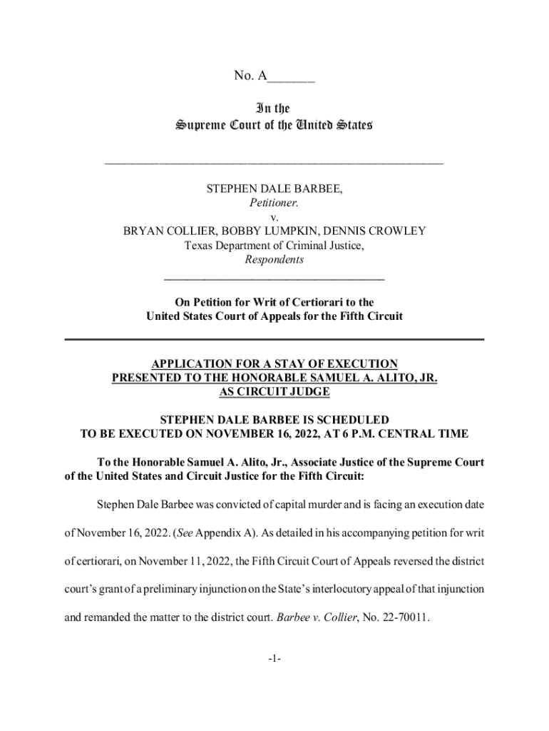 No. A___ In the Supreme Court of the United States ___ STEPHEN DALE BARBER, Petitioner. v. BRYAN COLLIER, BOBBY LUMPKIN, DENNIS CROWLEY Texas Department of Criminal Justice, Respondents ___ On Petition