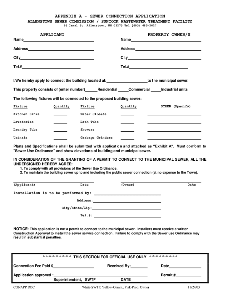 APPENDIX A SEWER CONNECTION APPLICATION ALLENTOWN SEWER COMMISSION / SUNROOF WASTEWATER TREATMENT FACILITY 36 Canal St. Allentown, NH 03275 Tel (603) 4852027APPLICANTPROPERTY OWNER/SNameNameAddressAddressCityCityTel.#Tel.#I/We