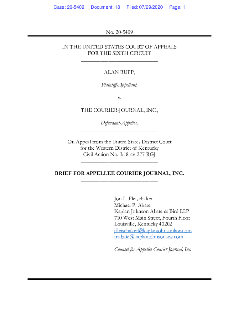 Case: 205409Document: 18Filed: 07/29/2020Page: 1No. 205409 IN THE UNITED STATES COURT OF APPEALS FOR THE SIXTH CIRCUIT ___ ALAN RUMP, PlaintiffAppellant, v. THE COURIERJOURNAL, INC., DefendantAppellee.