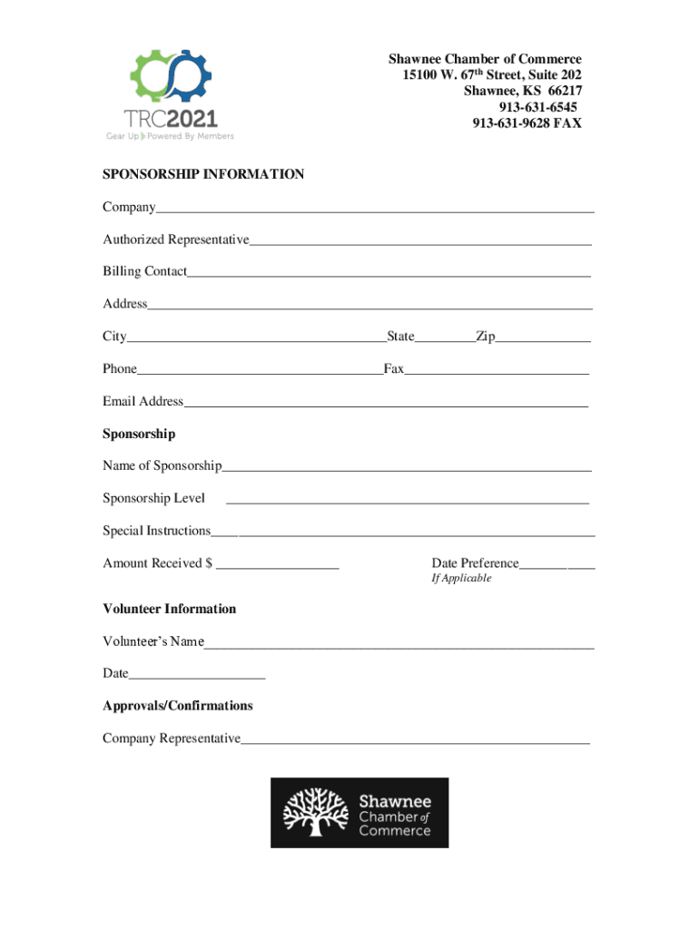 Shawnee Chamber of Commerce 15100 W. 67th Street, Suite 202 Shawnee, KS 66217 9136316545 9136319628 SPONSORSHIP INFORMATION Company___ Authorized Representative___ Billing Contact___ Address___ City___State___Zip___