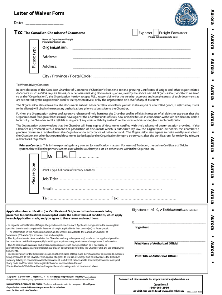 Date: ___To: The Canadian Chamber of CommerceExporterFreight Forwarder(Please tick appropriate box)Please typeface of Organization/Freight Forwarder/Broker, etc.:Organization:___Address:___Address:___Aurora
