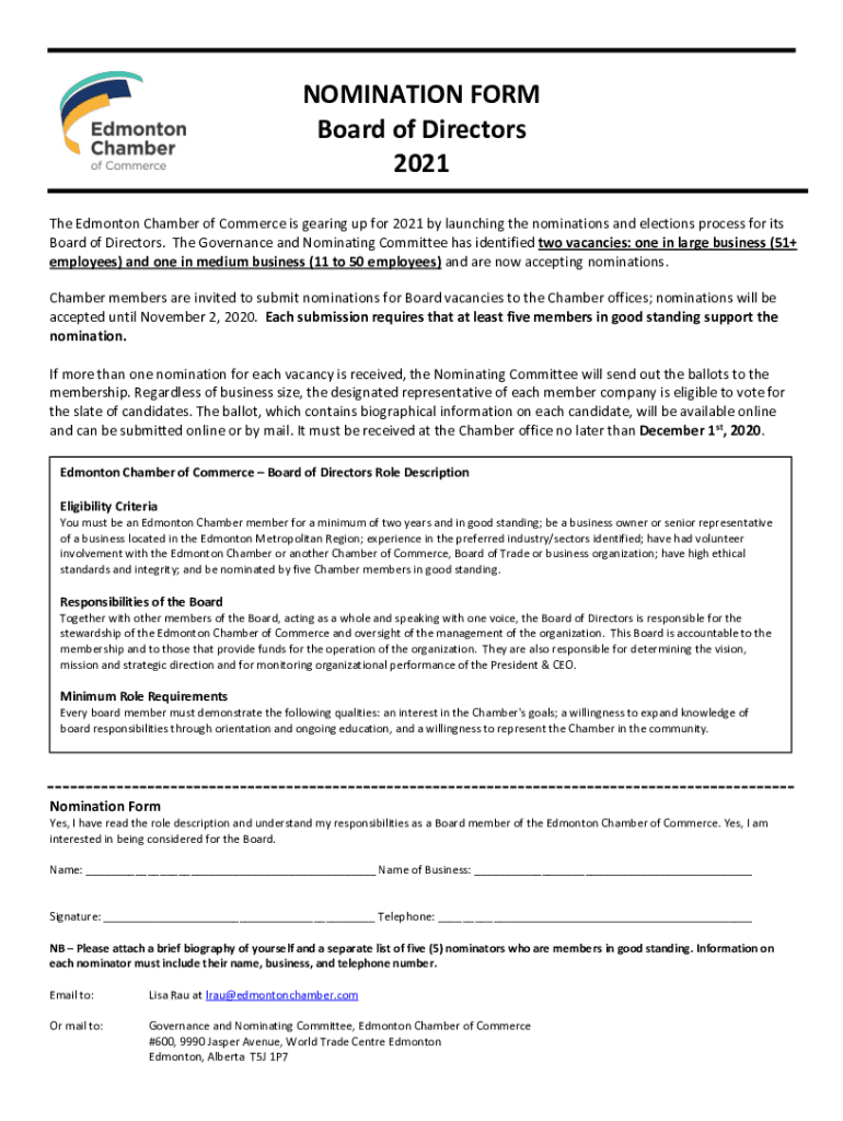 NOMINATION FORM Board of Directors 2021 The Edmonton Chamber of Commerce is gearing up for 2021 by launching the nominations and elections process for its Board of Directors. The Governance and Nominating