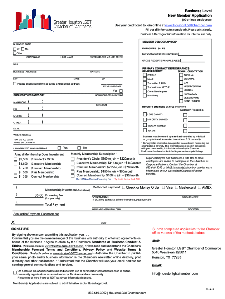 Business Level New Member Application (99 or fewer employees)Use your credit card to join online at www.HoustonLGBTChamber.com Fill out all information completely. Please print clearly. Business &