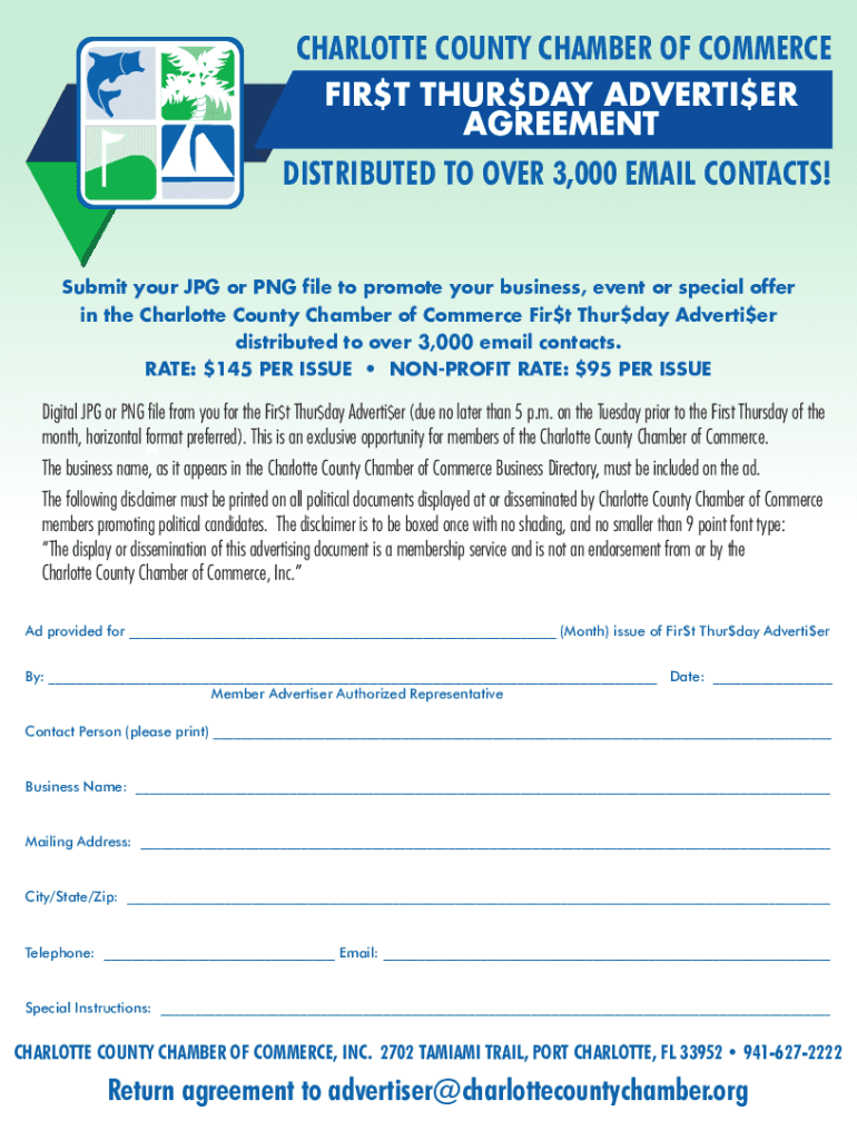 CHARLOTTE COUNTY CHAMBER OF COMMERCE FIRST THURSDAY ADVERTISER AGREEMENT DISTRIBUTED TO OVER 3,000 EMAIL CONTACTS! Submit your JPG or PNG file to promote your business, event or special offer in the