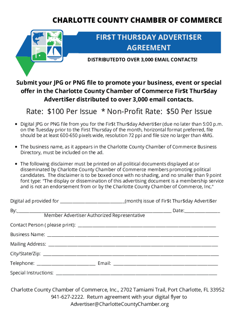 CHARLOTTE COUNTY CHAMBER OF COMMERCE FIRST THURSDAY ADVERTISER AGREEMENT DISTRIBUTED TO OVER 3,000 EMAIL CONTACTS! Submit your JPG or PNG file to promote your business, event or special offer in the