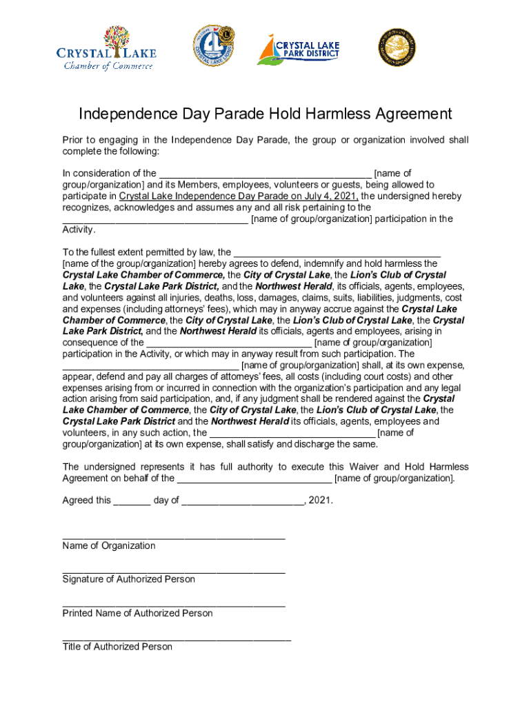 Independence Day Parade Hold Harmless Agreement Prior to engaging in the Independence Day Parade, the group or organization involved shall complete the following: In consideration of the ___ [name