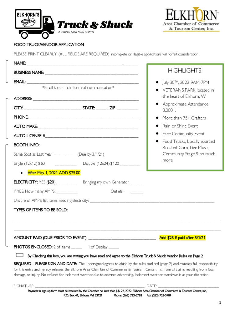 FOOD TRUCK/VENDOR APPLICATION PLEASE PRINT CLEARLY: (ALL FIELDS ARE REQUIRED) Incomplete or illegible applications will forfeit consideration. NAME: ___HIGHLIGHTS!BUSINESS NAME: ___ EMAIL: ___ *Email