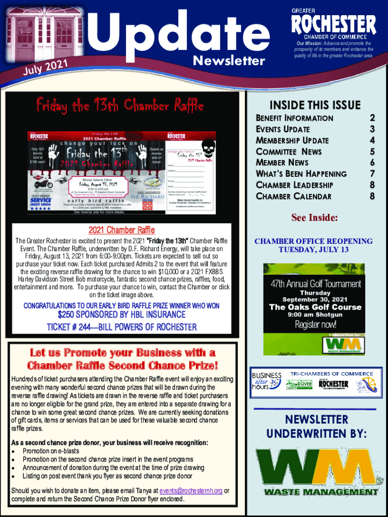 Update Newsletter Friday the 13th Chamber Raffles Mission: Advance and promote the prosperity of its members and enhance the quality of life in the greater Rochester area. INSIDE THIS ISSUE BENEFIT