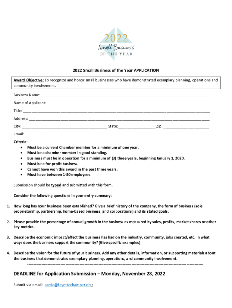 2022 Small Business of the Year APPLICATION Award Objective: To recognize and honor small businesses who have demonstrated exemplary planning, operations and community involvement. Business Name: