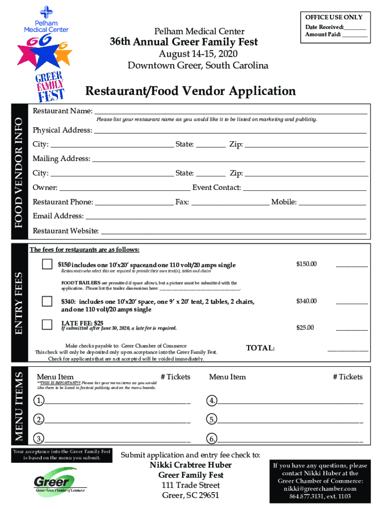 Pelham Medical Center36th Annual Greer Family Fest August 1415, 2020 Downtown Greer, South CarolinaRestaurant/Food Vendor Application DetailsABOUT GREER FAMILY FEST The Greer Family Fest is a festival