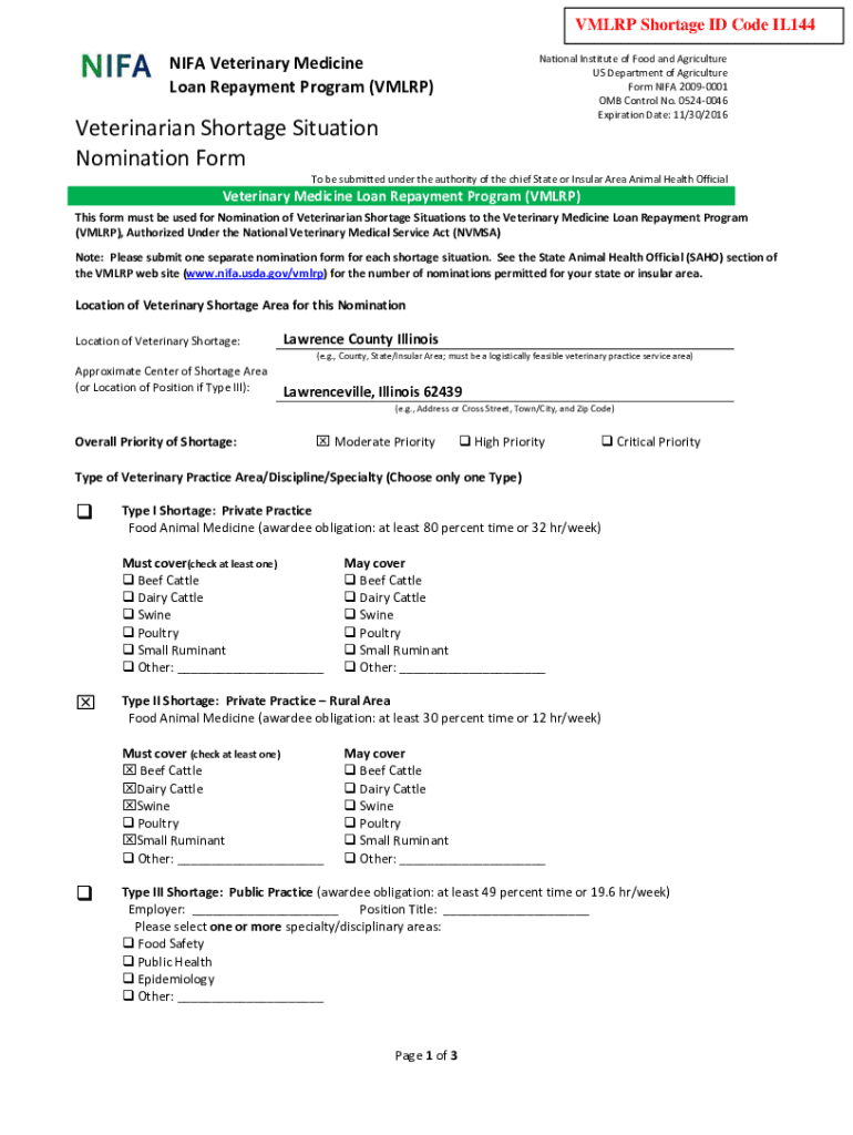 VM LRP Shortage ID Code IL144NIFA Veterinary Medicine Loan Repayment Program (VM LRP)National Institute of Food and Agriculture US Department of Agriculture Form FIFA 20090001 OMB Control No. 05240046