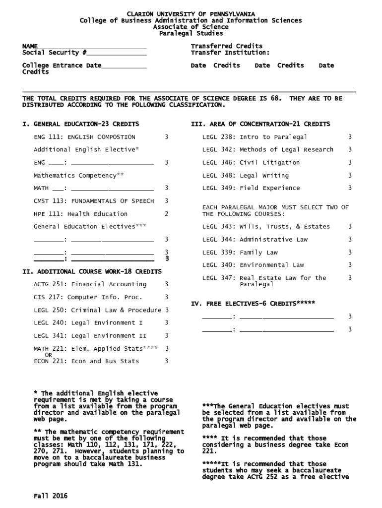 CLARION UNIVERSITY OF PENNSYLVANIA College of Business Administration and Information Sciences Associate of Science Paralegal Studies NAME Social Security #Transferred Credits Transfer Institution:College