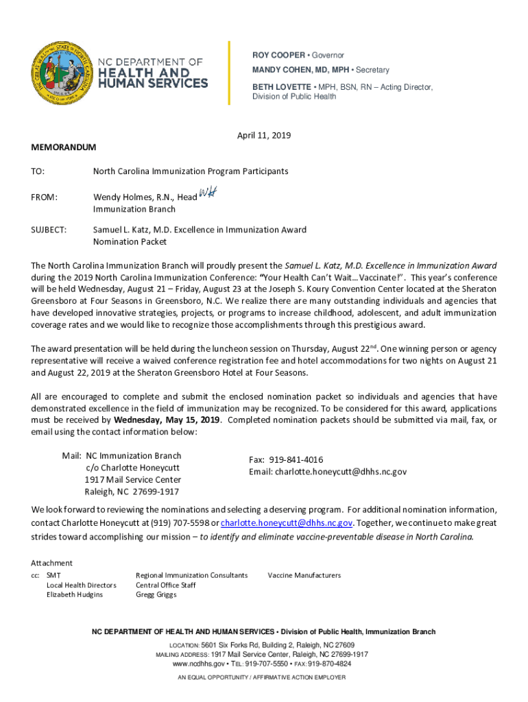 ROY COOPER Governor MANDY COHEN, MD, MPH Secretary BETH CORVETTE MPH, BSN, RN Acting Director, Division of Public Health April 11, 2019MEMORANDUM TO:North Carolina Immunization Program ParticipantsFROM:Wendy