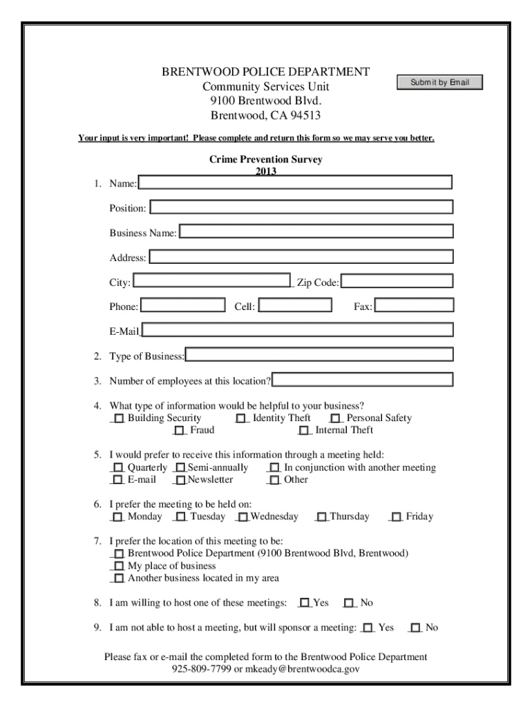 BRENTWOOD POLICE DEPARTMENT Community Services Unit 9100 Brentwood Blvd. Brentwood, CA 94513Submit by EmailYour input is very important! Please complete and return this form, so we may serve you better.