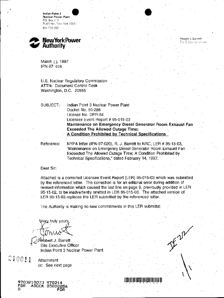 Indian Point 3 Nuclear Power Plant PO Box215 Buchanan, New, You k 10511 914 736.80010,WeWork Power 40 Authority Robert March 13, 1997 IPN97 038 U.S. Nuclear Regulatory Commission ATTN: Document Control