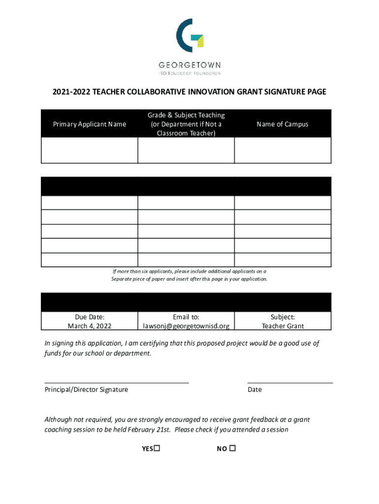 20212022 TEACHER COLLABORATIVE INNOVATION GRANT SIGNATURE Preprimary Applicant Namesake & Subject Teaching (or Department if Not a Classroom Teacher)Name of CampusAdditional Applicant Namesake & Subject