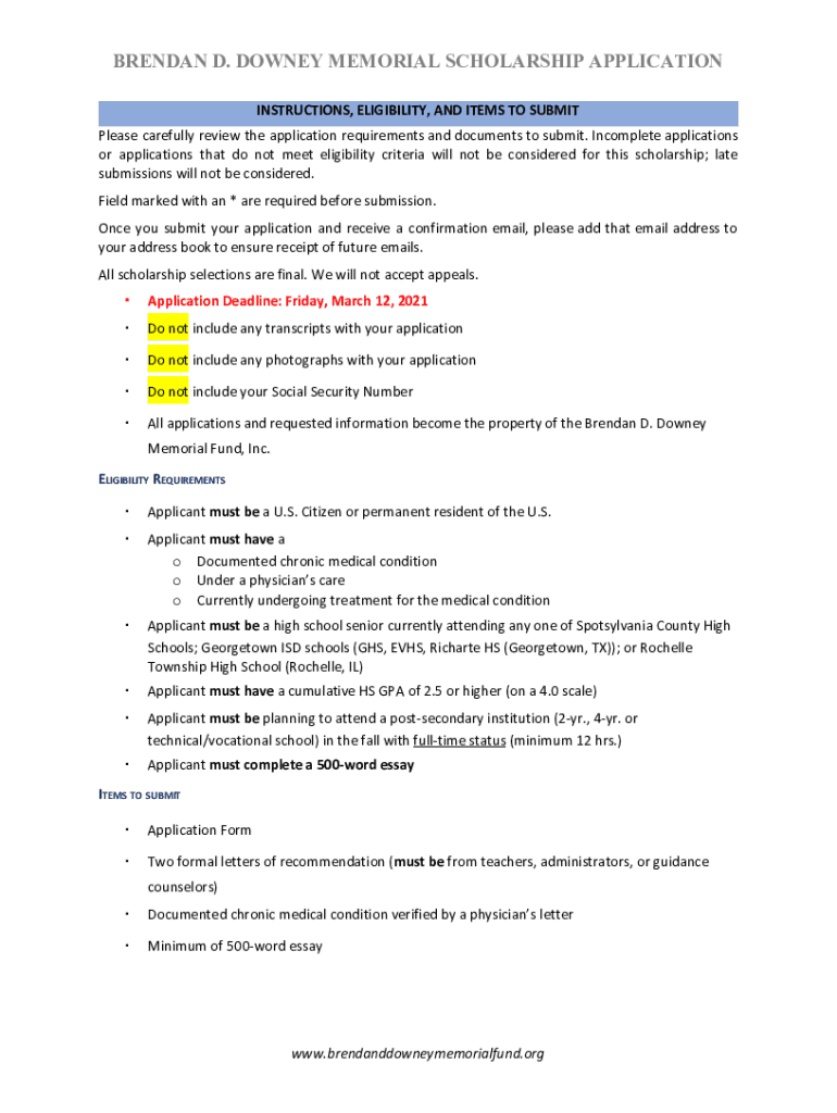 BRENDAN D. DOWNEY MEMORIAL SCHOLARSHIP APPLICATION INSTRUCTIONS, ELIGIBILITY, AND ITEMS TO SUBMIT Please carefully review the application requirements and documents to submit. Incomplete applications