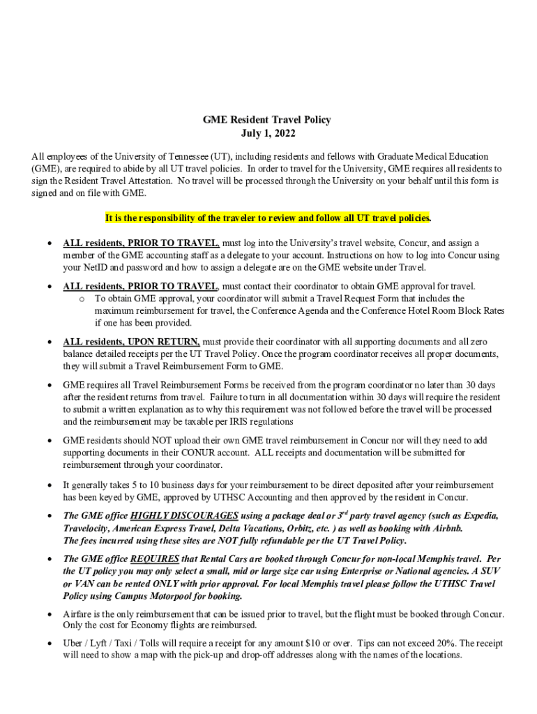 ME Resident Travel Policy July 1, 2022, All employees of the University of Tennessee (UT), including residents and fellows with Graduate Medical Education (ME), are required to abide by all UT travel