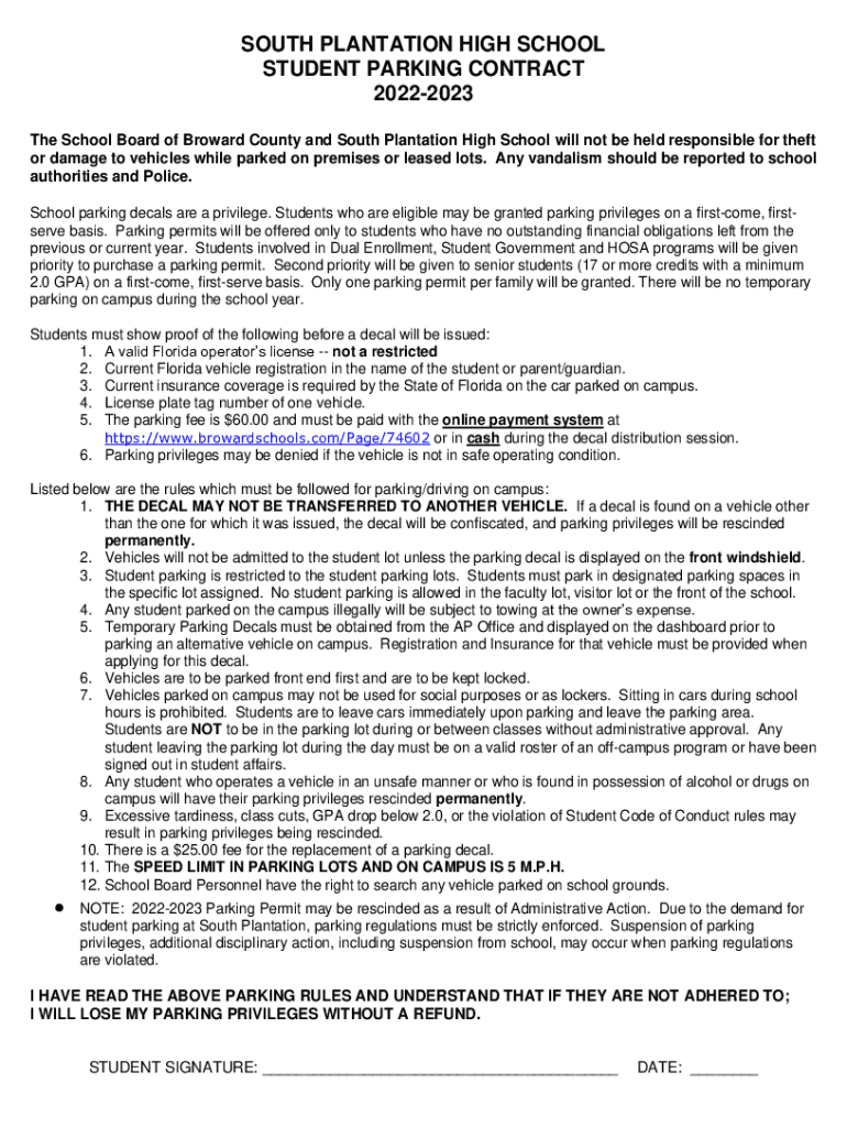 SOUTH PLANTATION HIGH SCHOOL STUDENT PARKING CONTRACT 20222023 The School Board of Broward County and South Plantation High School will not be held responsible for theft or damage to vehicles while