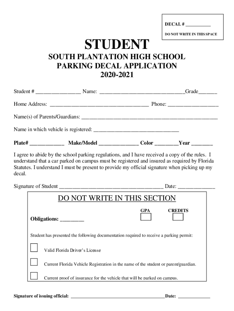 DECAL # ___ DO NOT WRITE IN THIS SPACESTUDENT SOUTH PLANTATION HIGH SCHOOL PARKING DECAL APPLICATION 20202021 Student # ___ Name: ___Grade___ Home Address: ___ Phone: ___ Name(s) of Parents/Guardians: