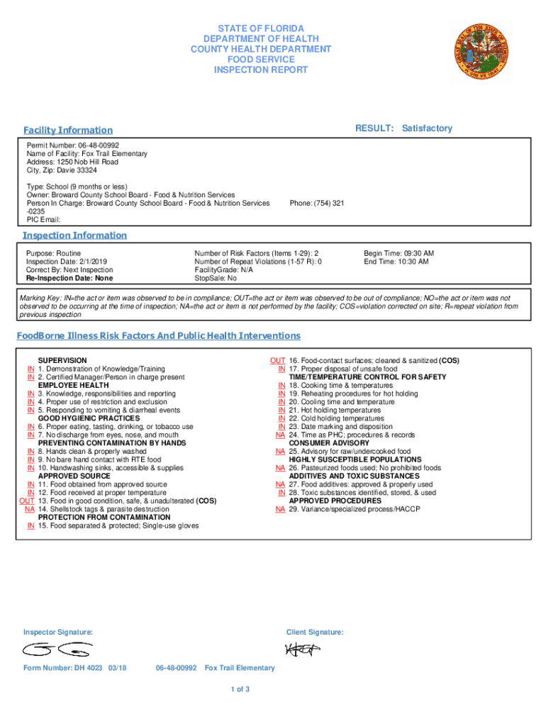 STATE OF FLORIDA DEPARTMENT OF HEALTH COUNTY HEALTH DEPARTMENT FOOD SERVICE INSPECTION REPORTRESULT: SatisfactoryFacility Information Permit Number: 064800992 Name of Facility: Fox Trail Elementary