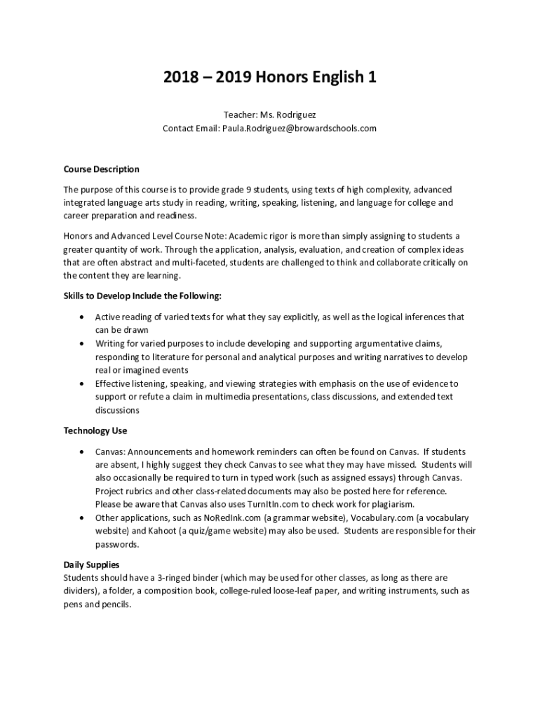 2018 2019 Honors English 1 Teacher: Ms. Rodriguez Contact Email: Paula.Rodriguez@browardschools.comCourse Description The purpose of this course is to provide grade 9 students, using texts of high