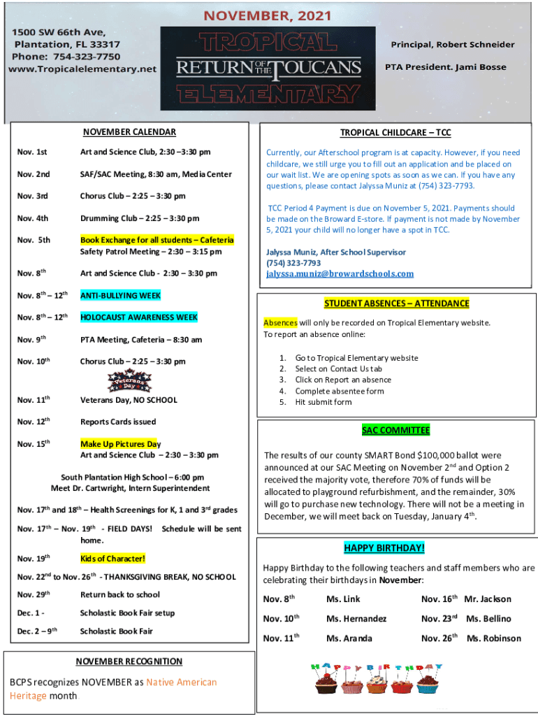 NOVEMBER CALENDAR Nov. 1stArt and Science Club, 2:30 3:30 pm Nov. 2ndSAF/SAC Meeting, 8:30 am, Media Center Nov. 3rdChorus Club 2:25 3:30 pm Nov. 4thDrumming Club 2:25 3:30 pm Nov. 5thBook Exchange