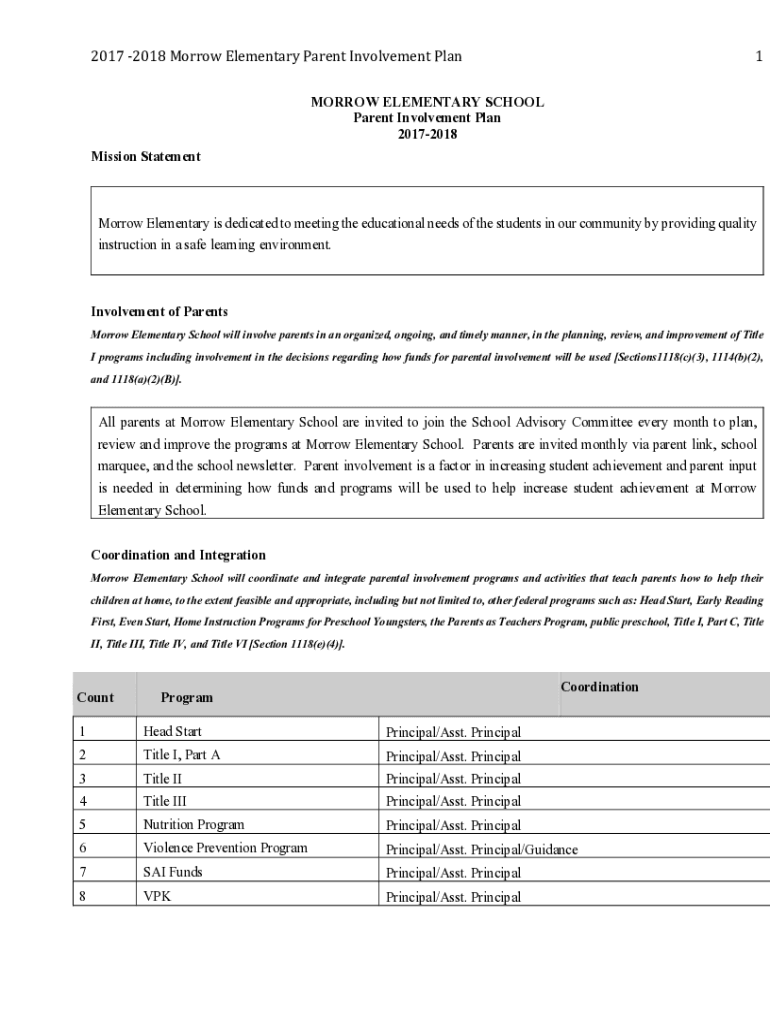 2017 2018 Morrow Elementary Parent Involvement Plan1MORROW ELEMENTARY SCHOOL Parent Involvement Plan 20172018 Mission Statement Morrow Elementary is dedicated to meeting the educational needs of the