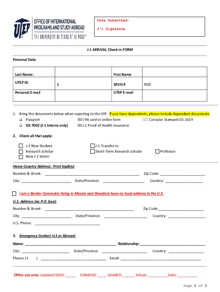 Date Submitted: J1 SignatureJ1 ARRIVAL Checking FORM Personal Data Last Name:First Lamented IDEAS #8Personal EmailN00UTEP Email1. Bring the documents below when reporting to the OIL. If you have dependents,