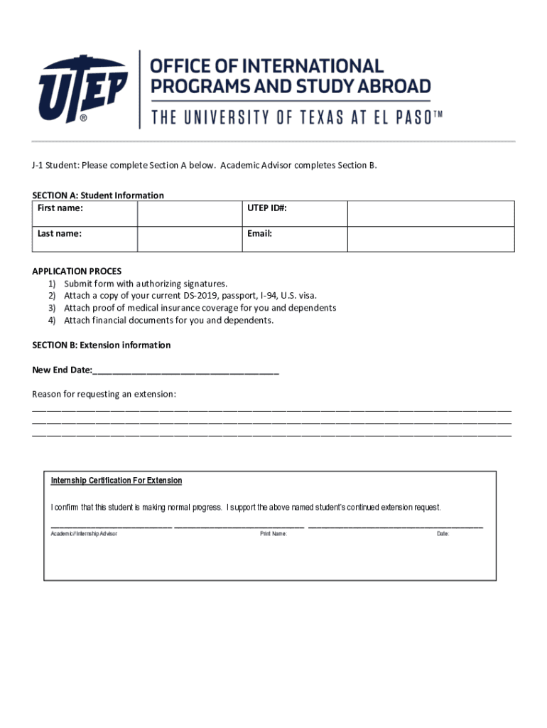 J1 Student: Please complete Section A below. Academic Advisor completes Section B. SECTION A: Student Information First name: Last name:UTEP ID#: Email:APPLICATION PROCESS 1) Submit form with authorizing