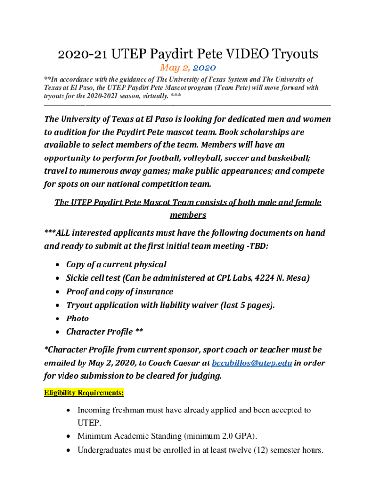202021 UTEP Pay dirt Pete VIDEO Tryouts May 2, 2020**In accordance with the guidance of The University of Texas System and The University of Texas at El Paso, the UTEP Pay dirt Pete Mascot program