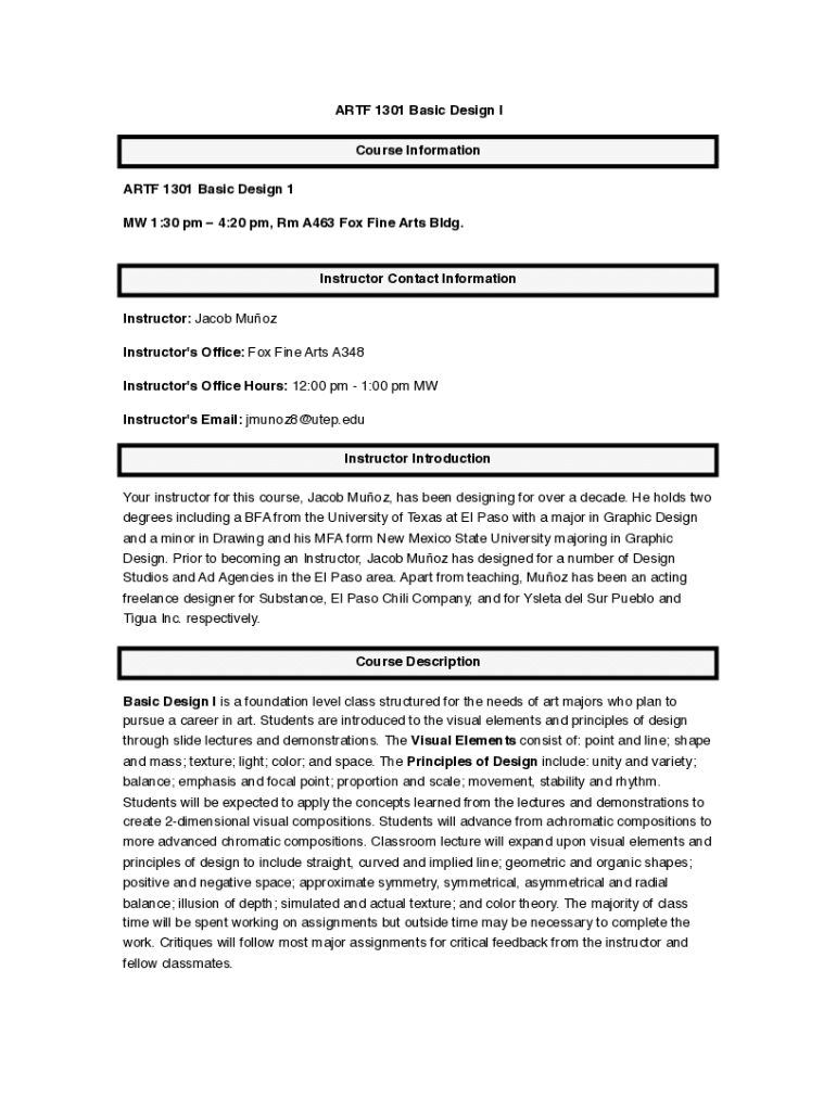 ART 1301 Basic Design I Course Information ART 1301 Basic Design 1 MW 1:30 pm 4:20 pm, Rm A463 Fox Fine Arts Bldg. Instructor Contact Information Instructor: Jacob Munoz Instructor\'s Office: Fox