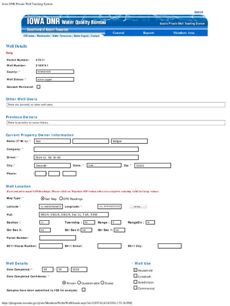 Iowa DNR Private Well Tracking System 86818GeneralReportsWell Details Help Permit Number:47511Well Number:2189741County:*WINNESHIEK WINNESHIEKWell Status:*Active Logged Active LoggedGeosam Reviewed:Other