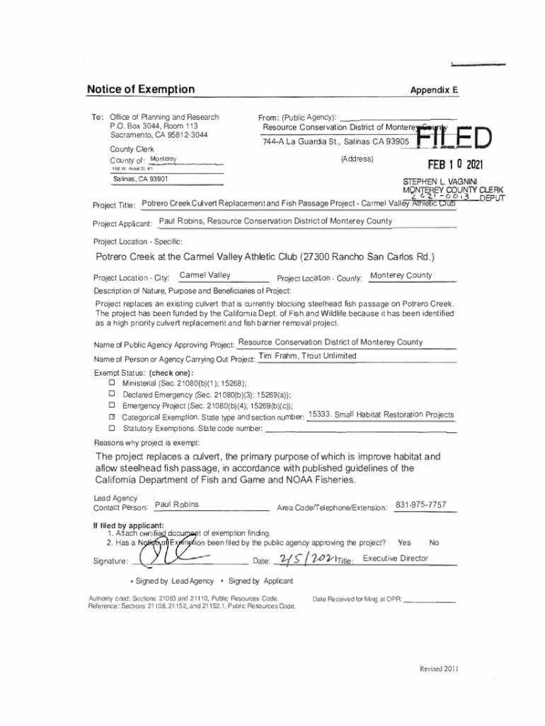 Notice of ExemptionAppendix To: Office of Planning and Research P.O. Box 3044, Room 113 Sacramento, CA 958123044County Clerk County of: _M_o_nt_er_ey_ _ __ _From: (Public Agency): ___ D Resource Conservation
