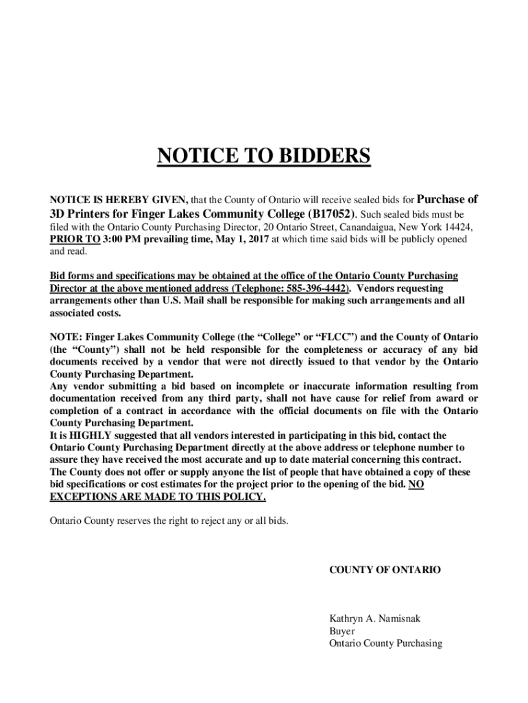 NOTICE TO BIDDERS NOTICE IS HEREBY GIVEN, that the County of Ontario will receive sealed bids for Purchase of 3D Printers for Finger Lakes Community College (B17052). Such sealed bids must be filed