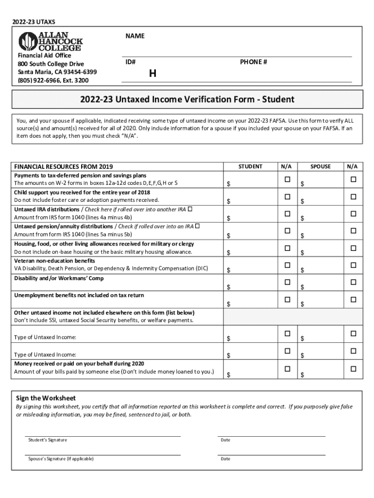202223 UTAXSNAME Financial Aid Office 800 South College Drive Santa Maria, CA 934546399 (805) 9226966, Ext. 3200ID#PHONE #H202223 Untamed Income Verification Form Student You, and your spouse if applicable,