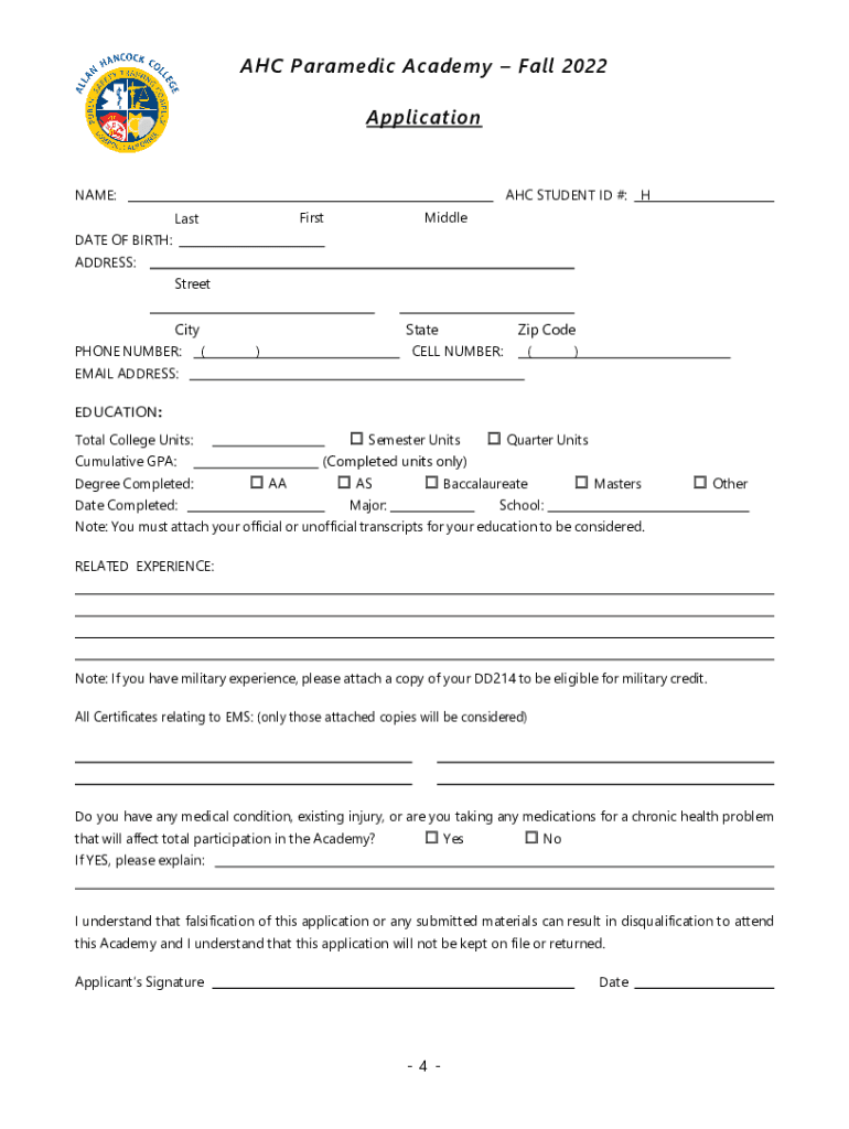 E EMERGENCY M MEDICAL S SERVICES PARAMEDIC A ACADEMY A APPLICATION FALL 2022A APPLICATION D DEADLINE :J ONE 10, 2022 @ 4:00 PMF IRE, SAFETY AND EMERGENCY MEDICAL SERVICES O n e H a co c k Dr iv e,