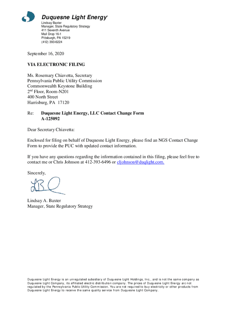 Duquesne Light Energy Lindsay Baxter Manager, State Regulatory Strategy 411 Seventh Avenue Mail Drop 161 Pittsburgh, PA 15219 (412) 3936224September 16, 2020 VIA ELECTRONIC FILING Ms. Rosemary Ciabatta,