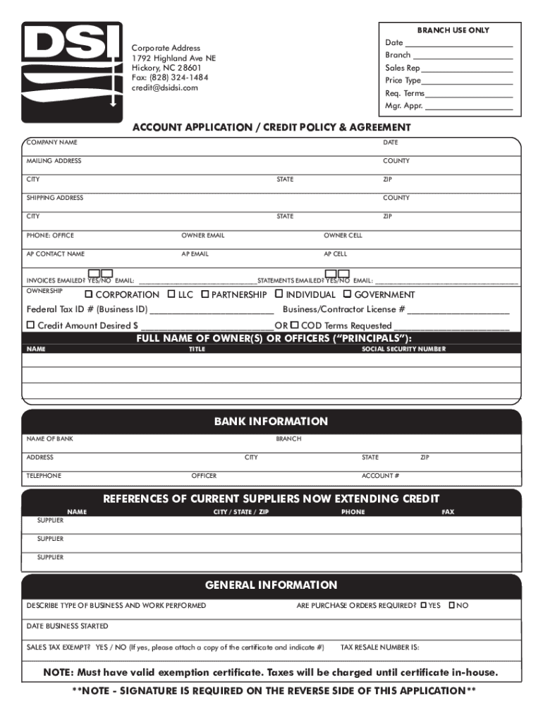 BRANCH USE ONLY Date___Corporate Address 1792 Highland Ave NE Hickory, NC 28601 Fax: (828) 3241484 credit@dsidsi.com Branch___ Sales Rep___ Price Type___ Req. Terms___ Mgr. APPR.___ACCOUNT APPLICATION