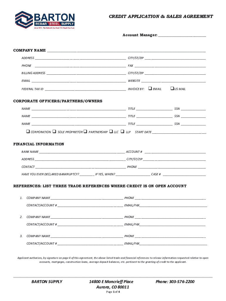 CREDIT APPLICATION & SALES AGREEMENTAccount Manager: ___COMPANY NAME ___ ADDRESS ___ CITY/ST/ZIP ___ PHONE___ FAX ___BILLING ADDRESS ___ CITY/ST/ZIP ___ EMAIL ___ WEBSITE ___ FEDERAL TAX ID ___ INVOICE