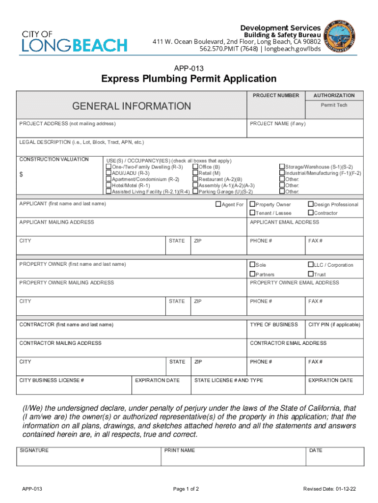 Get the free APP-013 Express Plumbing Permit Application - Long Beach, California