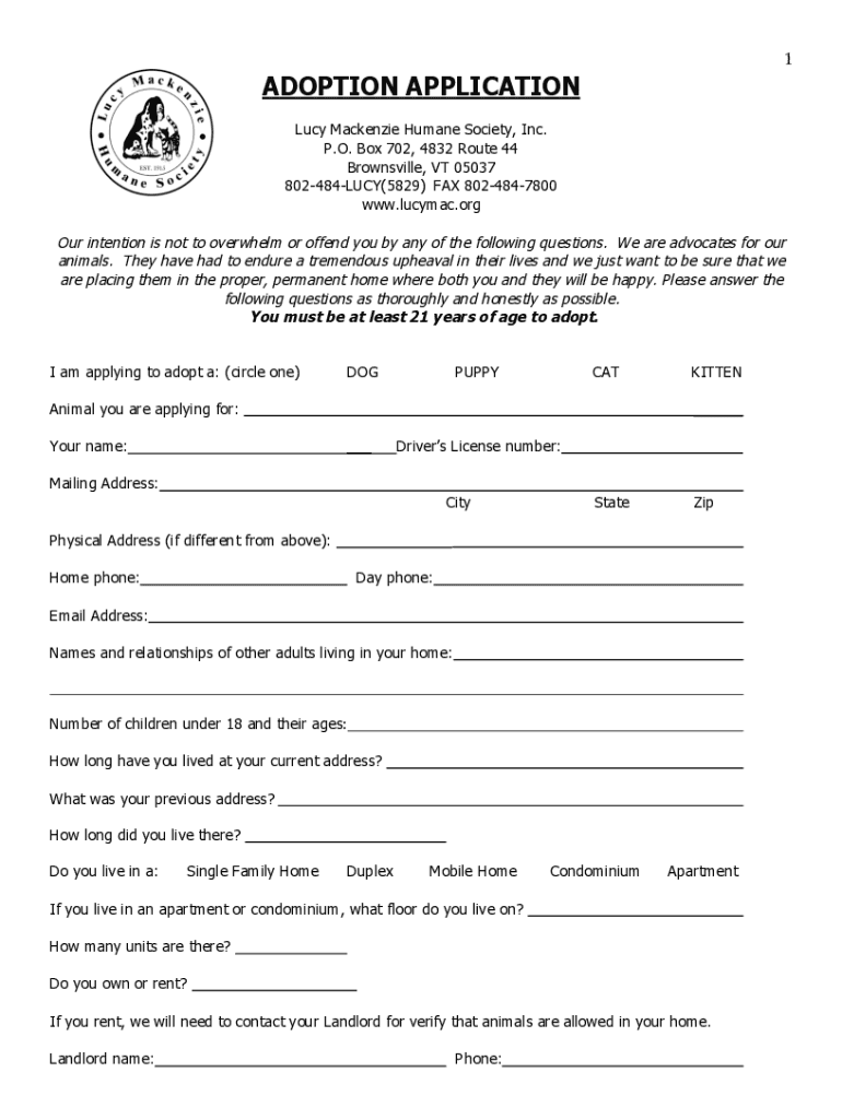1ADOPTION APPLICATION Lucy Mackenzie Humane Society, Inc. P.O. Box 702, 4832 Route 44 Brownsville, VT 05037 802484LUCY(5829) FAX 8024847800 www.lucymac.orgOur intention is not to overwhelm or offend