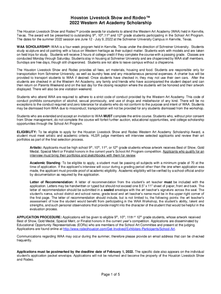 Houston Livestock Show and Rodeo 2022 Western Art Academy Scholarship The Houston Livestock Show and Rodeo provide awards for students to attend the Western Art Academy (WAS) held in Kerrville, Texas.