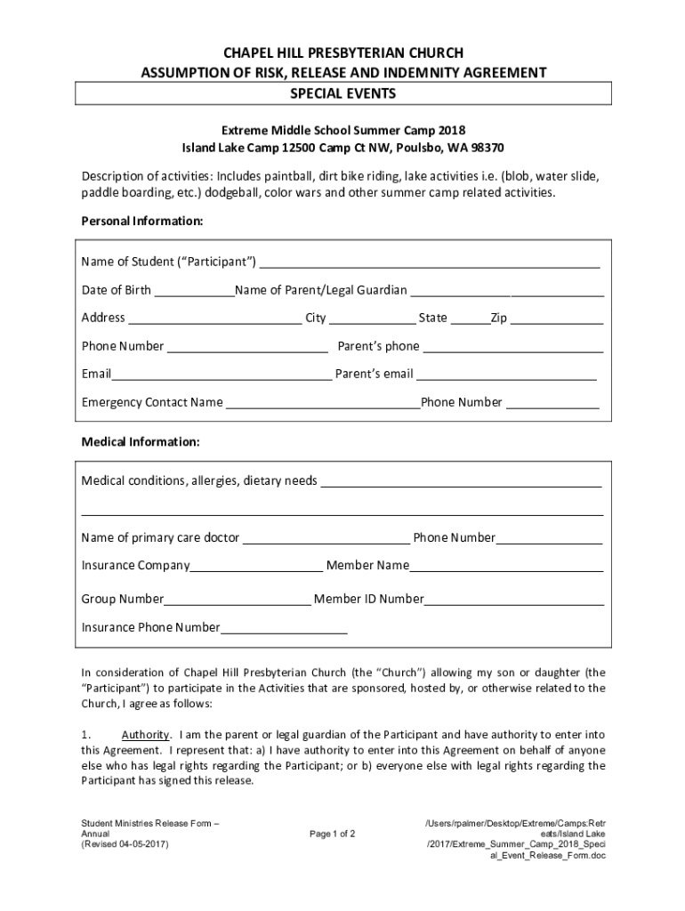 CHAPEL HILL PRESBYTERIAN CHURCHASSUMPTION OF RISK, RELEASE AND INDEMNITY AGREEMENTSPECIAL EVENTSExtreme Middle School Summer Camp 2018Island Lake Camp 12500 Camp Ct NW, Polls, WA 98370Description