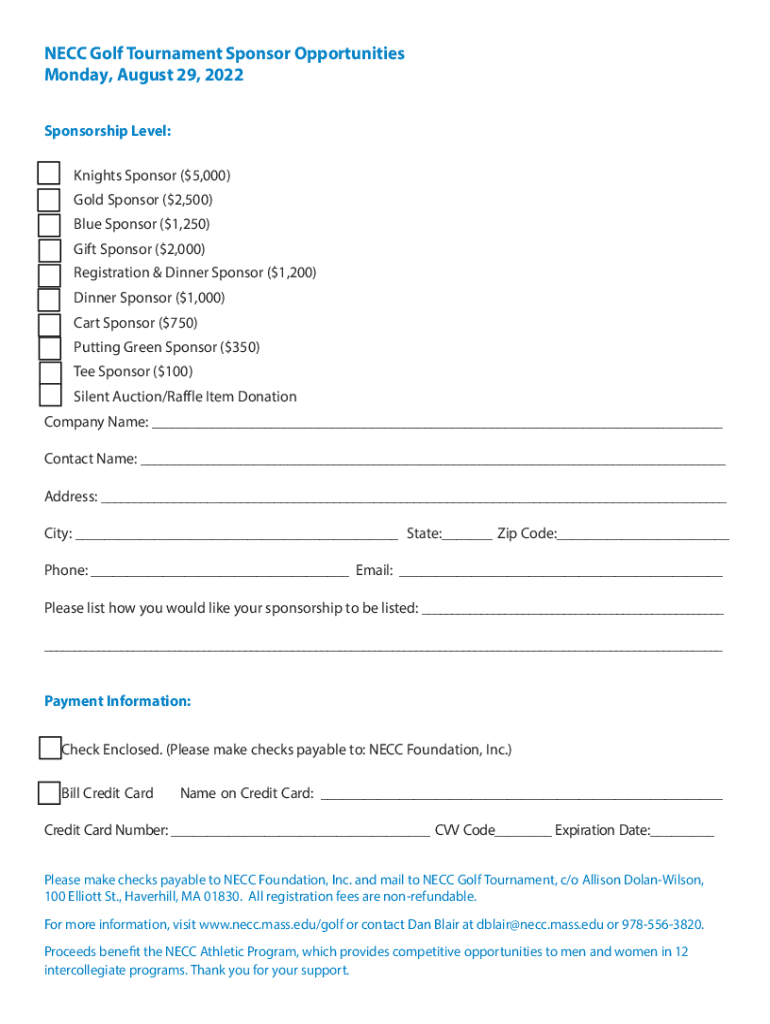 Get the free NECC Athletics Golf Tournament. Golf Tournament Sponsor Form