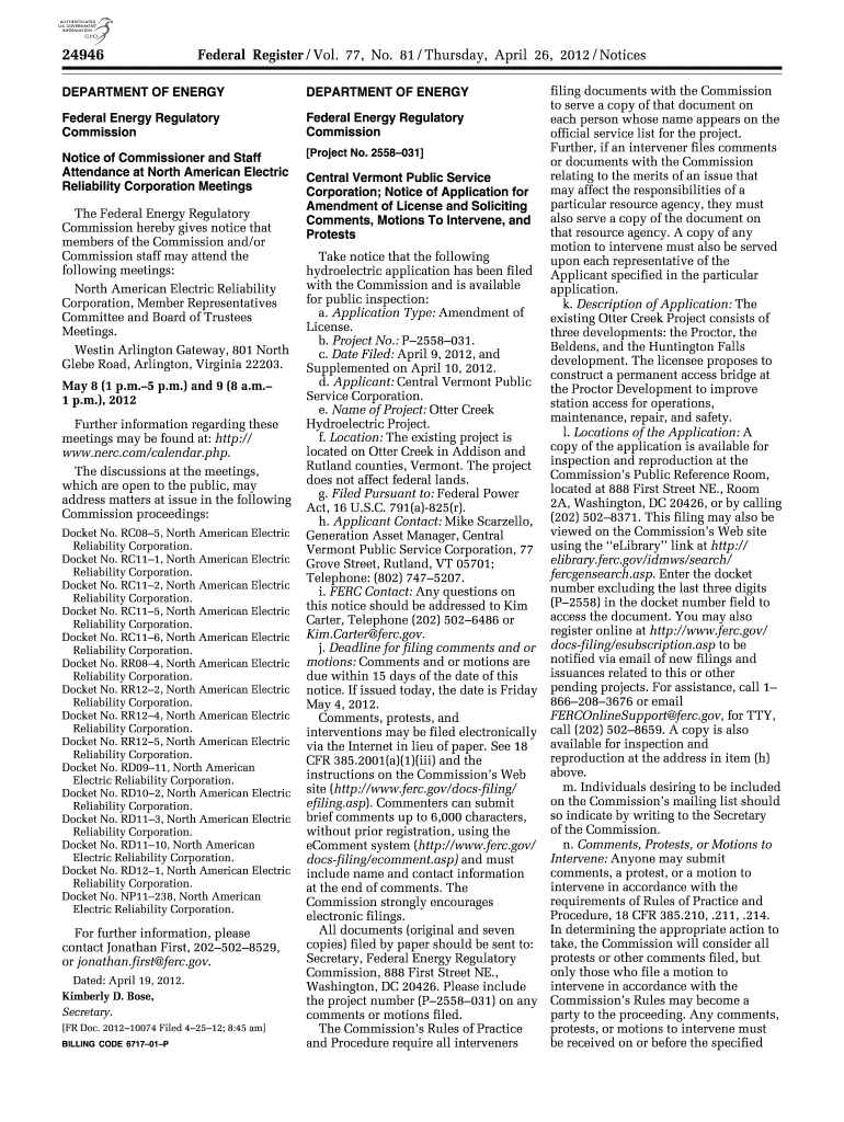 This document provides notice of attendance by members of the Federal Energy Regulatory Commission at the North American Electric Reliability Corporation meetings, detailing the relevant dates and