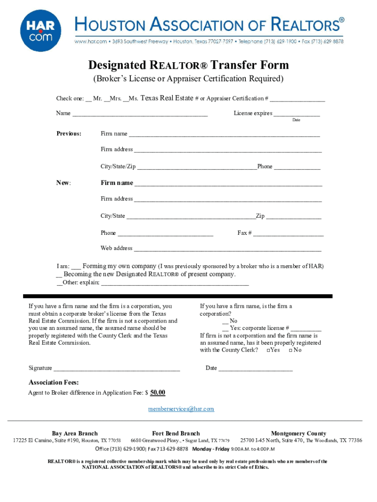 Designated REALTOR Transfer Form (Brokers License or Appraiser Certification Required) Check one: __ Mr. __Mrs. __Ms. Texas Real Estate # or Appraiser Certification # ___Name ___License expires ___